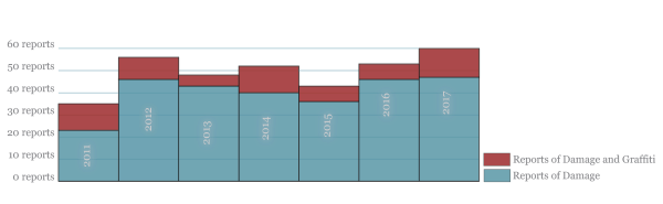 Without historical data on the problem we could not say that its dramatically trending, although we do know that significant damage has been done recently. So for the final map I have simply explained this in text. Without complex algorithms a small text cutin can have a strong impact so long as it is not too long. Since this infographic was made another $4000 worth of damage has been done to the same area.