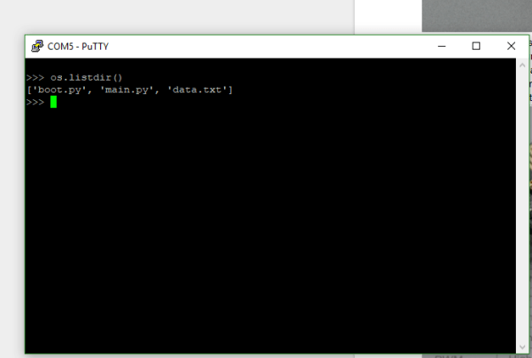 I’ve flashed micropython as the os, connected to the nodeMCU board using PuTTY and am showing what’s on the board in the screenshot below. By running os.listdir(), which is python for the linux ‘ls’ command you can see we have 3 files.