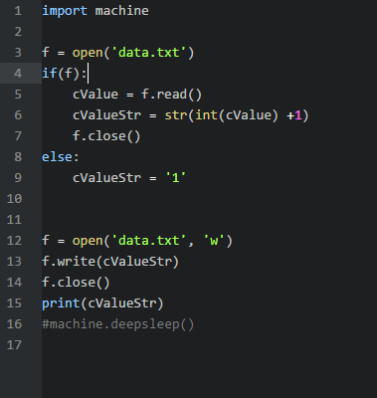 In essence when the board is reset or a button is pushed, technically the same thing in this case, then it opens up a text file called ‘data.txt’, saves the current value as a variable and then increment it by one. I’ll improve this later but as proof of concept it works.