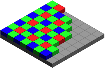 In order to capture the world in RGB we use filters over the array arranged into a pattern arranged to mimic the way the human eye captures information. (Thank you Wikipedia). This particular arrangement was invented by Bruce Bayers in the 1970’s. It filters for twice as many green filters to red or blue to mimic the human eye.