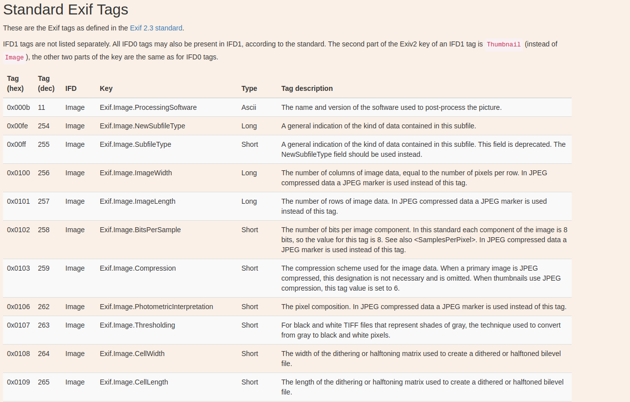 As a subject this one is quite new to me. There are many useful posts on the subject. Here’s one who uses the Python Image Library, but alas I could not get what I wanted from it. Nevertheless, it is a well written blog, here is the link incase you find it useful, and critically it also contains a link to the exif documentation which was very helpful for me to understand what I’m actually trying to access. While learning about how images are encoded a whole new world of detail opened up to me reading through this specification table.