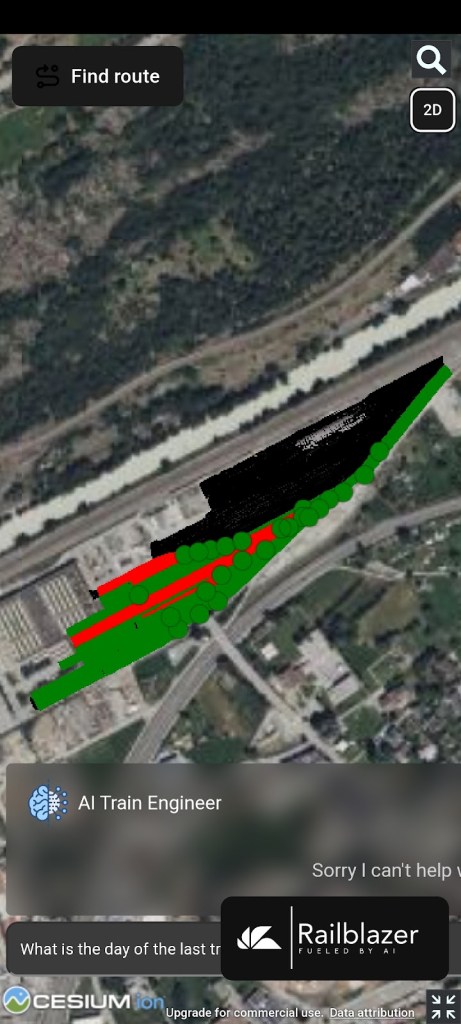 Taking this information into a 2D view with routing information was done by converting from the Swiss national grid to 4326 and then displaying with cesium, which can handle geospatial data in geojson format.